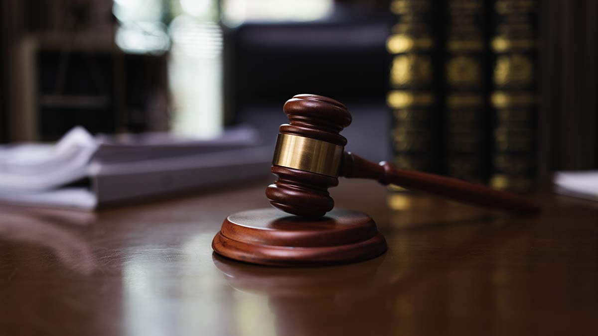 Ein Richterhammer liegt auf einem Pult, im Hintergrund Gesetzessammlungen.